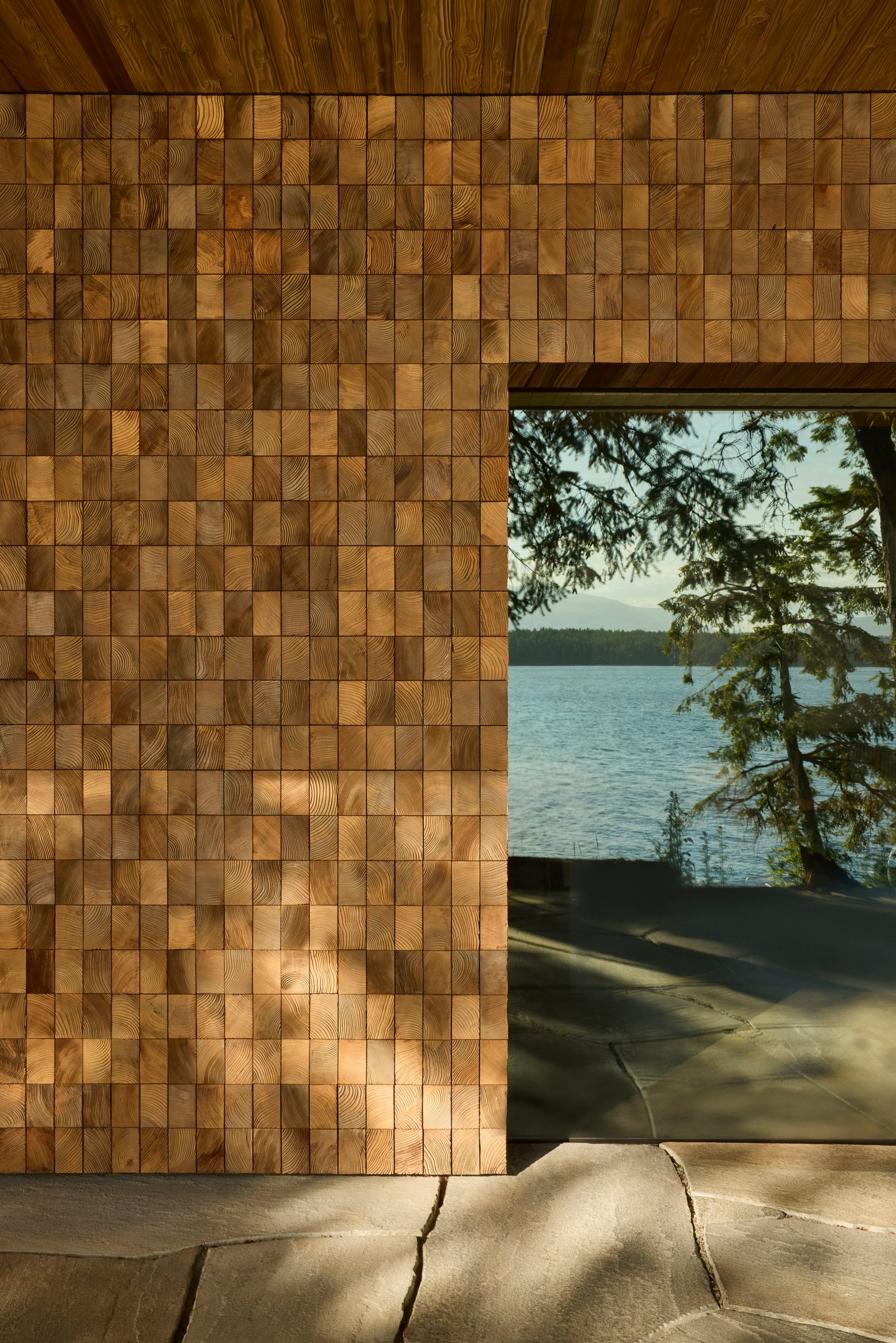 Фасады дома облицованы кедровыми досками, обработанными пескоструйным способом. Их текстура намеренно напоминает штабеля пиломатериалов — отсылка к истории региона, лесной промышленности и ремеслу.