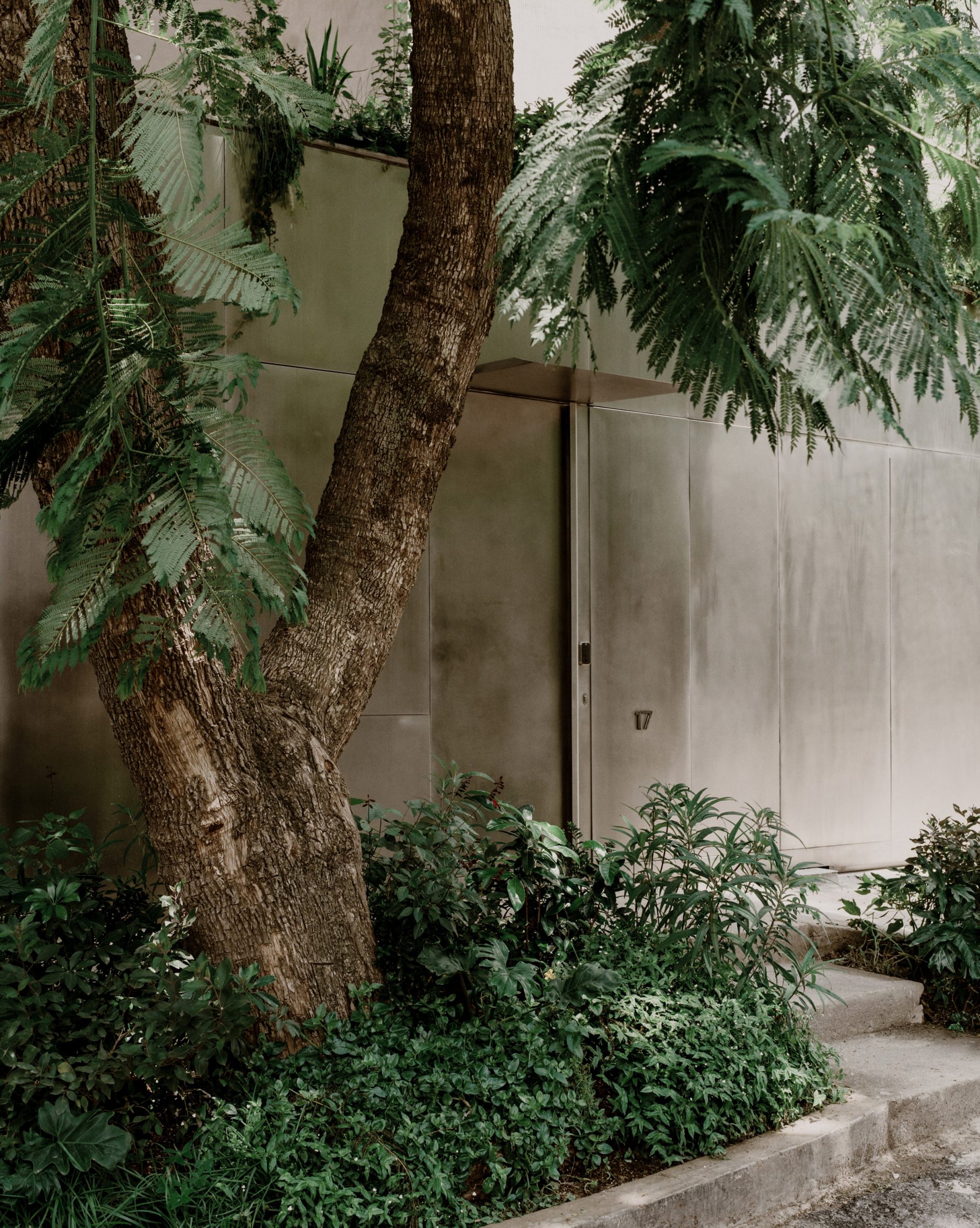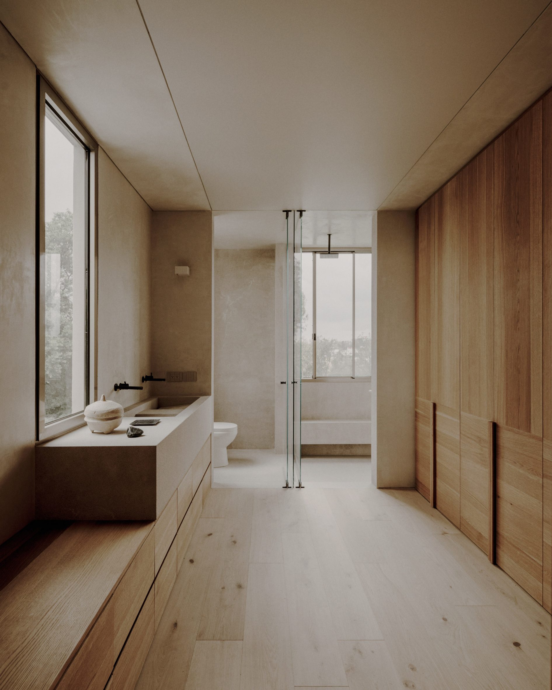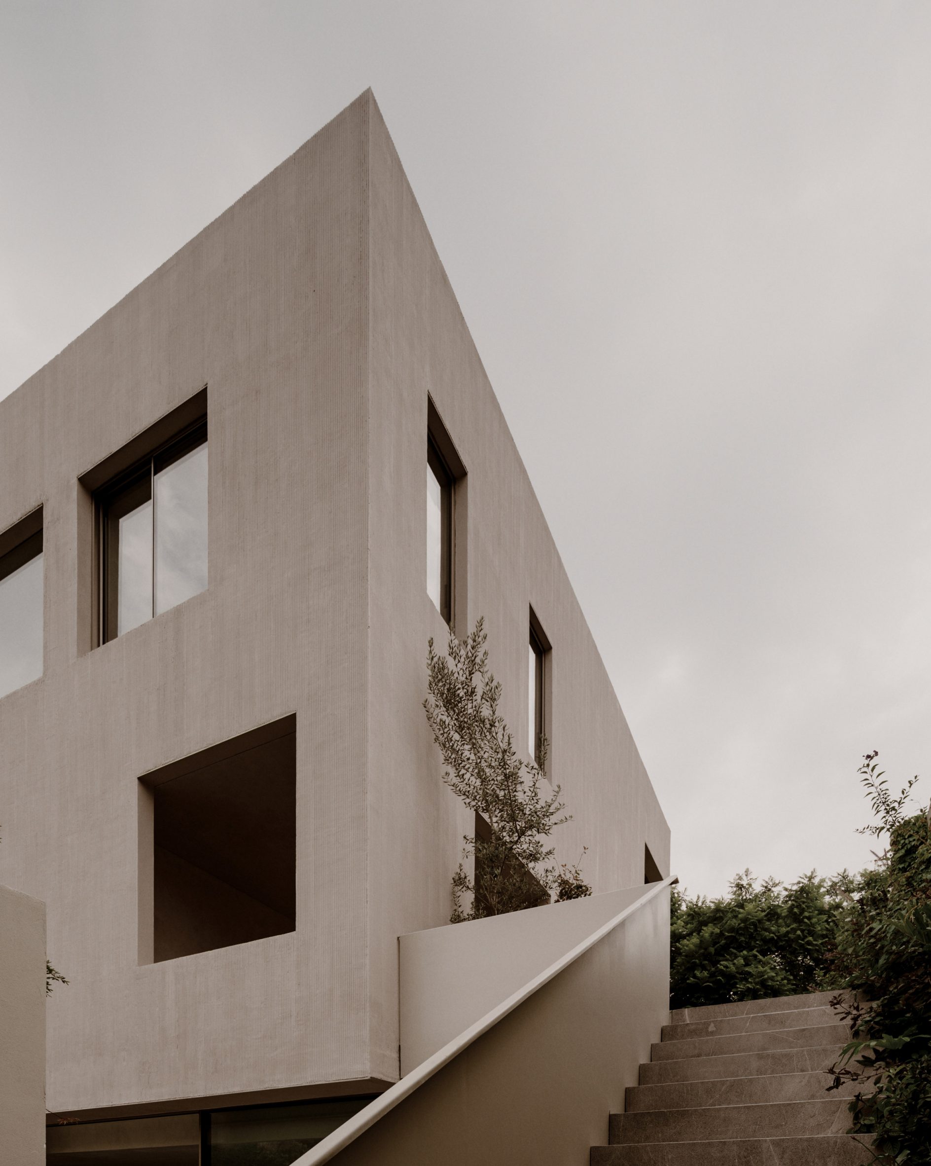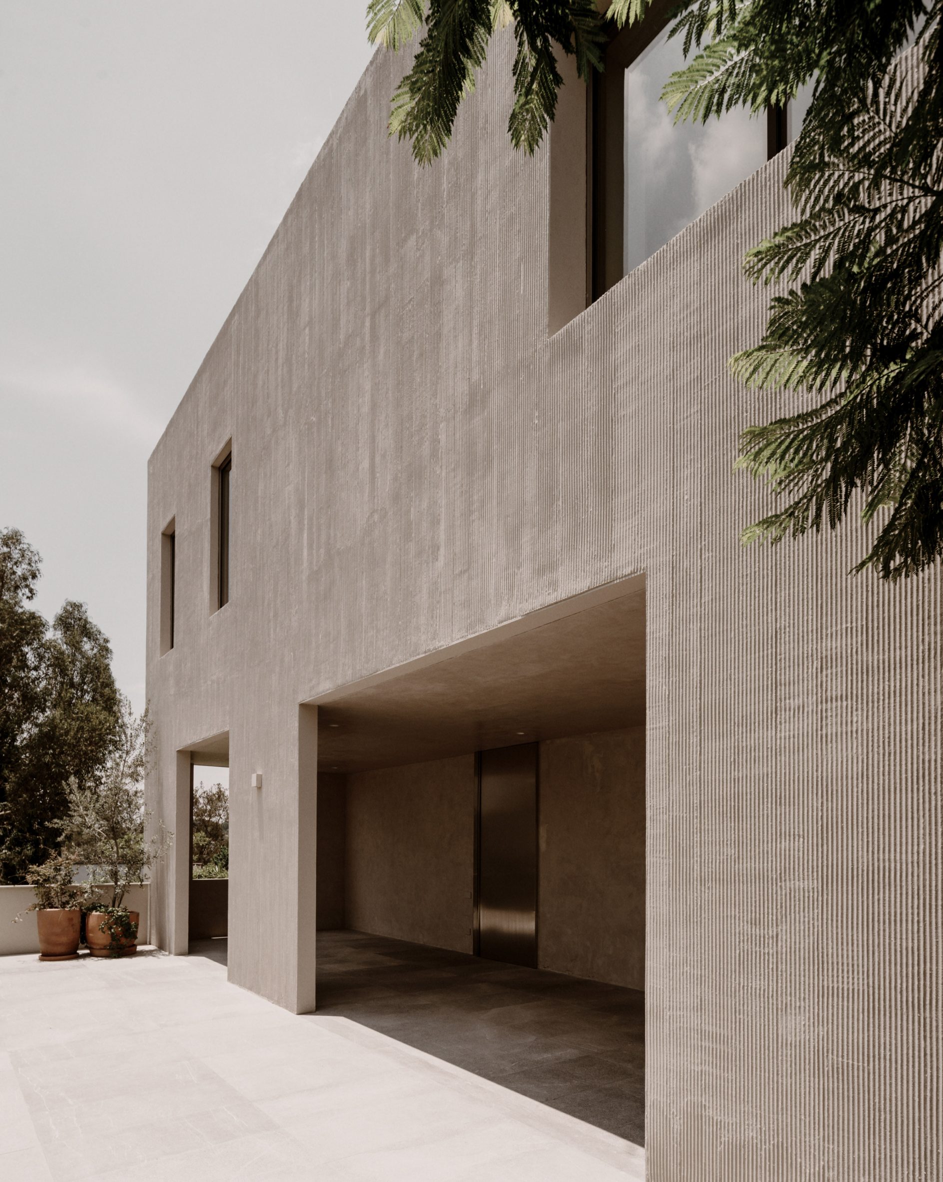 Несмотря на использование бетона, дом не выглядит агрессивным или «техническим». Напротив, его минимализм строится на спокойствии и равновесии.