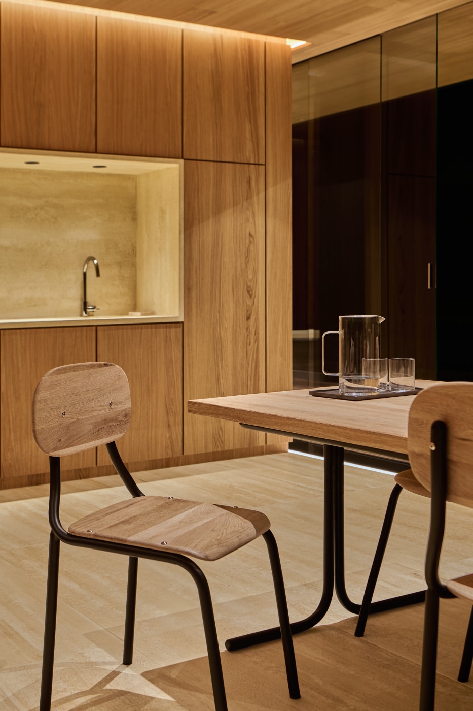 Мебель внутри DROPHAUS — отдельный манифест. Фаррелл Уильямс представил авторскую коллекцию Homework, созданную по принципу «десяти процентов несовершенства». Неровные линии, шероховатые формы, ощущение ручной работы — всё это намеренно подчёркивает присутствие человека, его рук и эмоций.