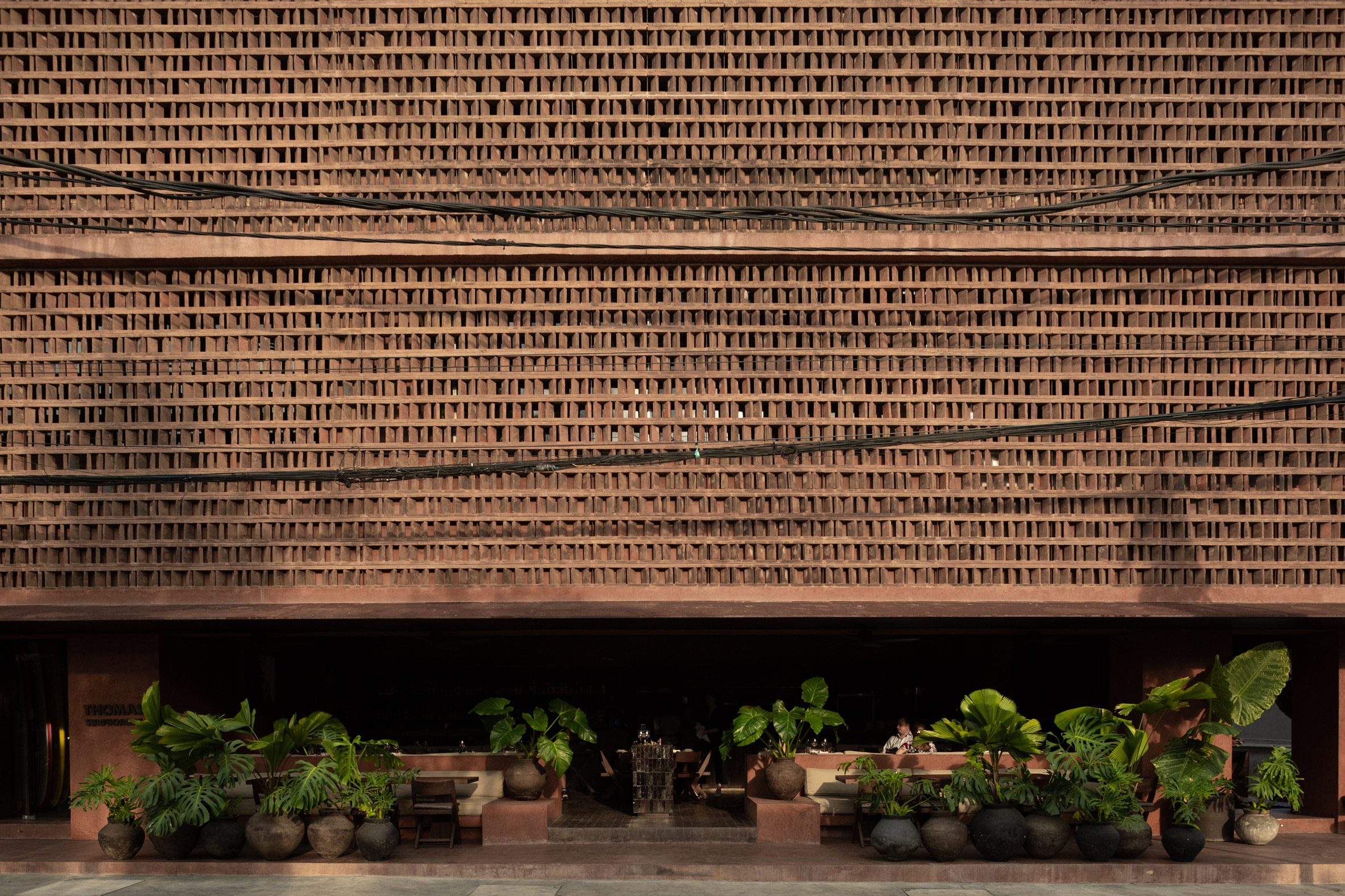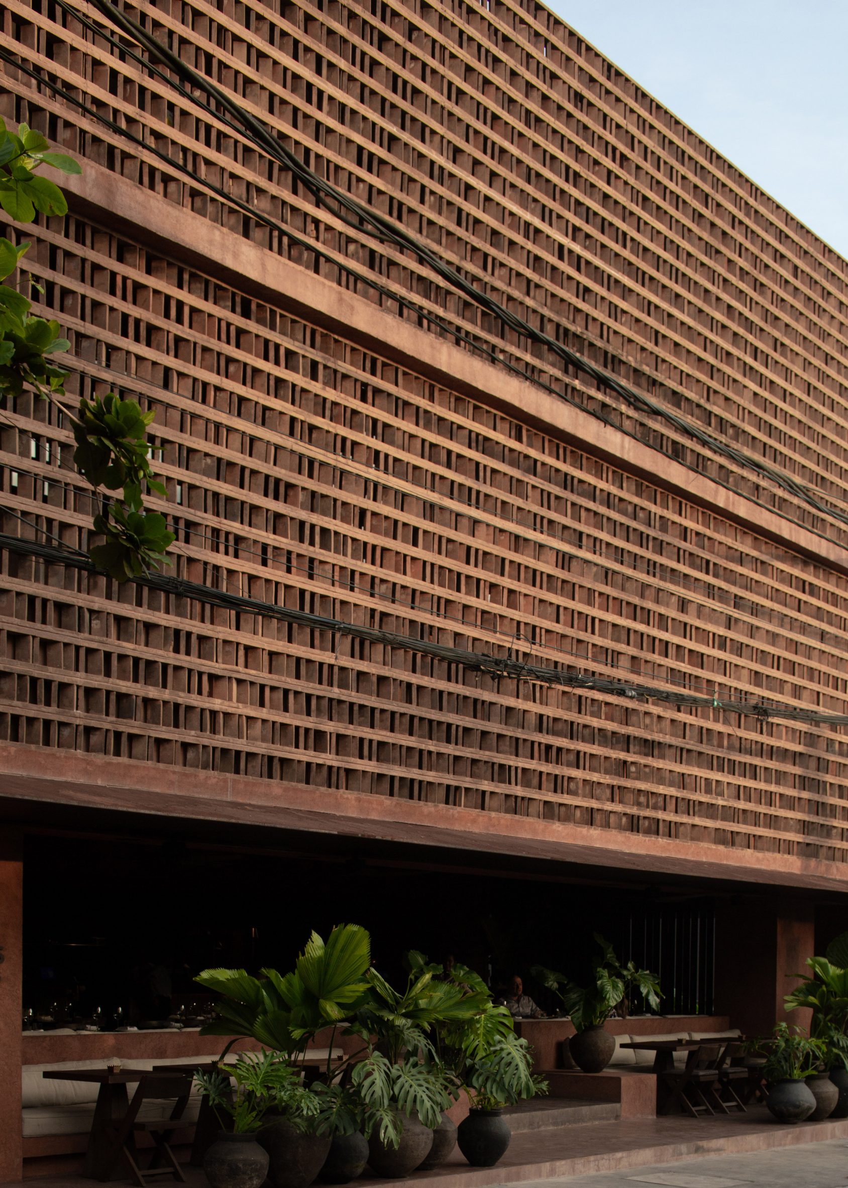 Главная визуальная тема проекта – ручная терракотовая кирпичная облицовка, которая мгновенно выделяет Further Hotel на фоне бетонных гигантов.