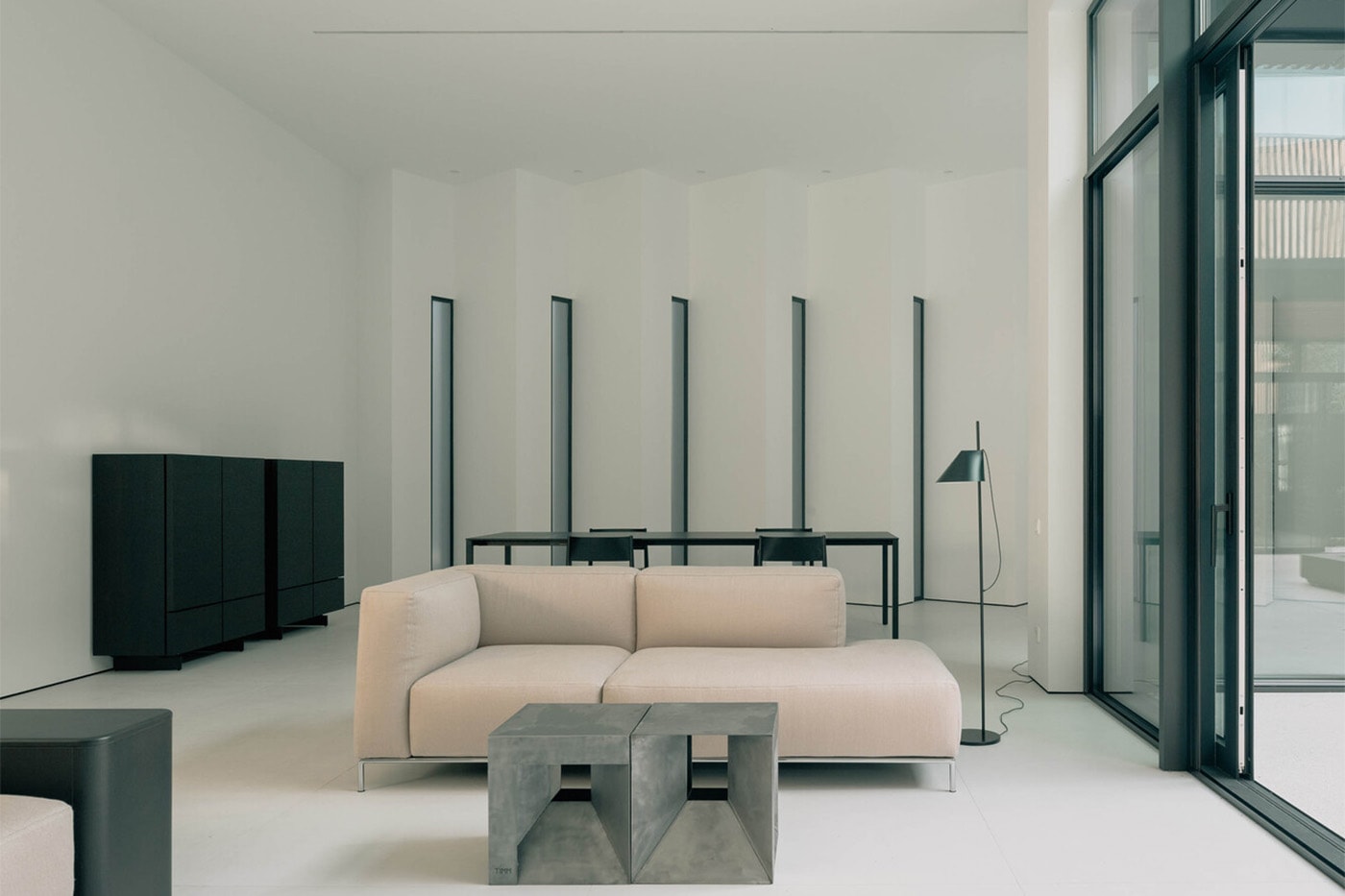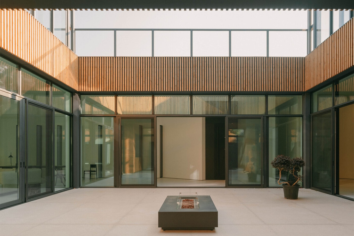 Архитекторы использовали минималистичную палитру материалов: открытый бетон, натуральное дерево и черные стальные элементы. Индустриальный, «сырой» стиль смягчается игрой света и тени, а внутренние дворики добавляют зелени и приватных уголков для отдыха.
