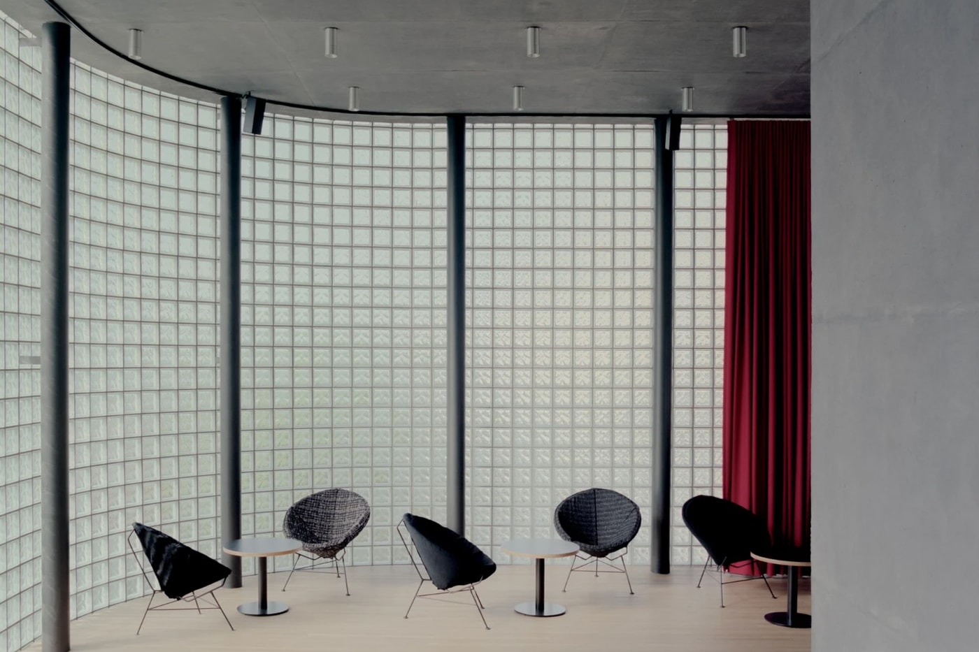 Внешне проект поражает контрастом материалов. Нижняя часть фасада выполнена из текстурированного бетона, отлитого в OSB-опалубку, создающую уникальный «тканевый» рельеф. Верхняя часть здания покрыта светящейся оболочкой из стеклянных блоков — своего рода «фонарь», который днём пропускает мягкий свет внутрь магазина, а ночью превращает флагман в сияющий маяк для Итаэвона.
