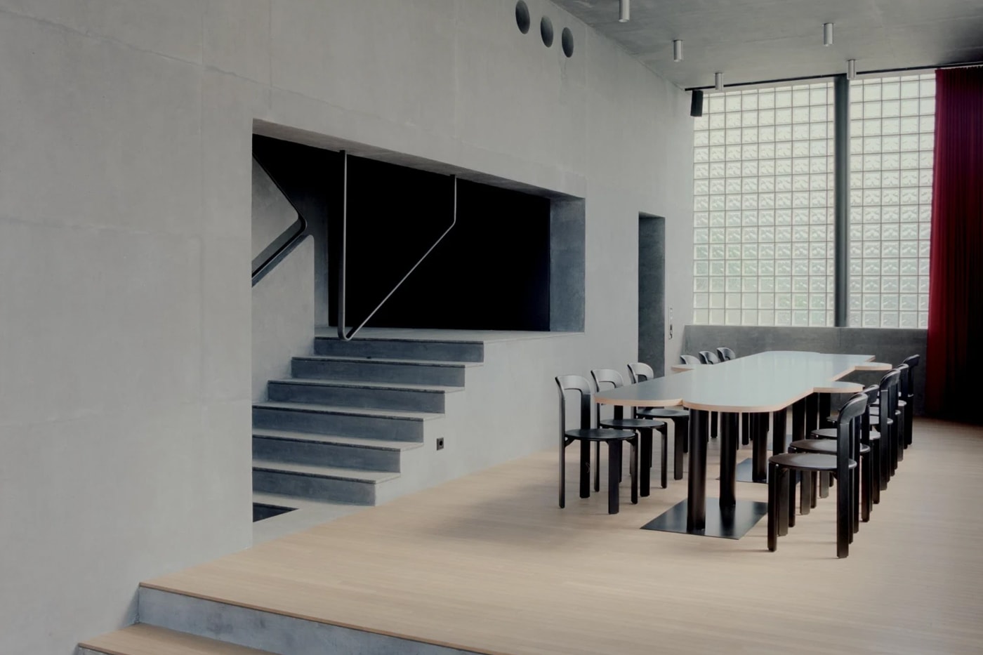 Внутреннее пространство разворачивается в несколько ярусов, адаптированных к крутизне участка. Мезонины соединены центральным вертикальным ядром, создавая кинематографическую последовательность потолков и пространств, где посетитель словно совершает путешествие через коллекции мужской и женской одежды. Асцетичная палитра материалов — бетон, сталь, камень, дерево — подчёркивает архитектуру, не отвлекая внимание от главного: одежды.