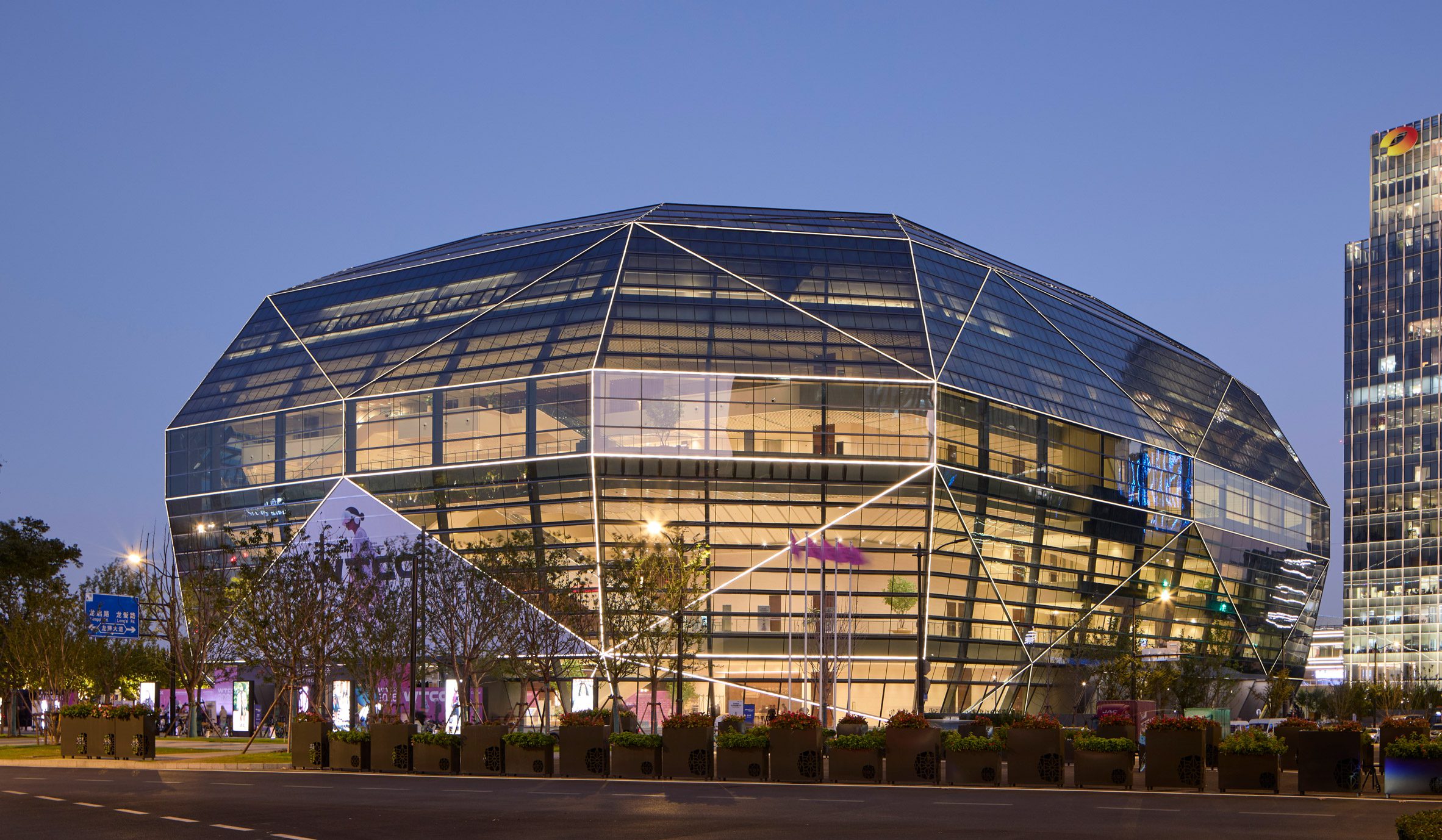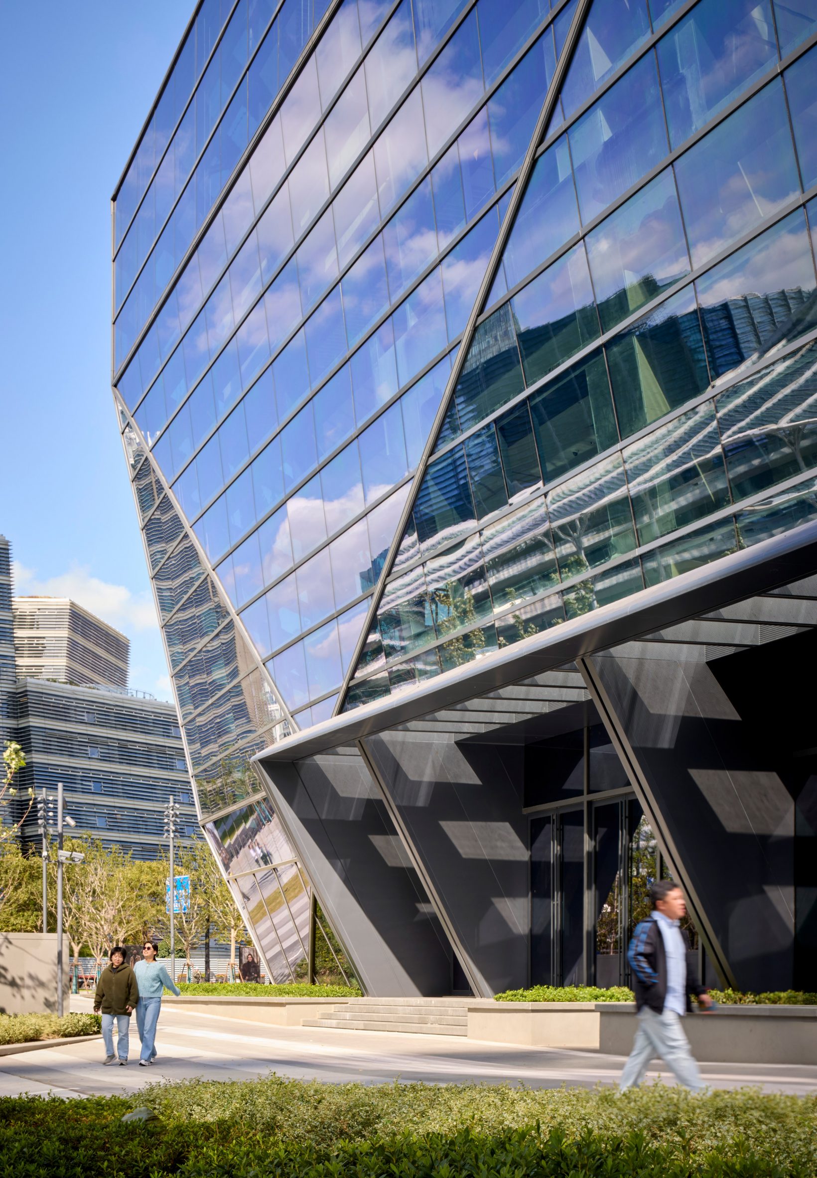 Площа центру — близько 60 000 квадратних метрів, і його форма одразу притягує погляд. Багатогранний скляний фасад нагадує огранований алмаз, що відбиває світло, воду річки Хуанпу та динаміку мегаполісу.