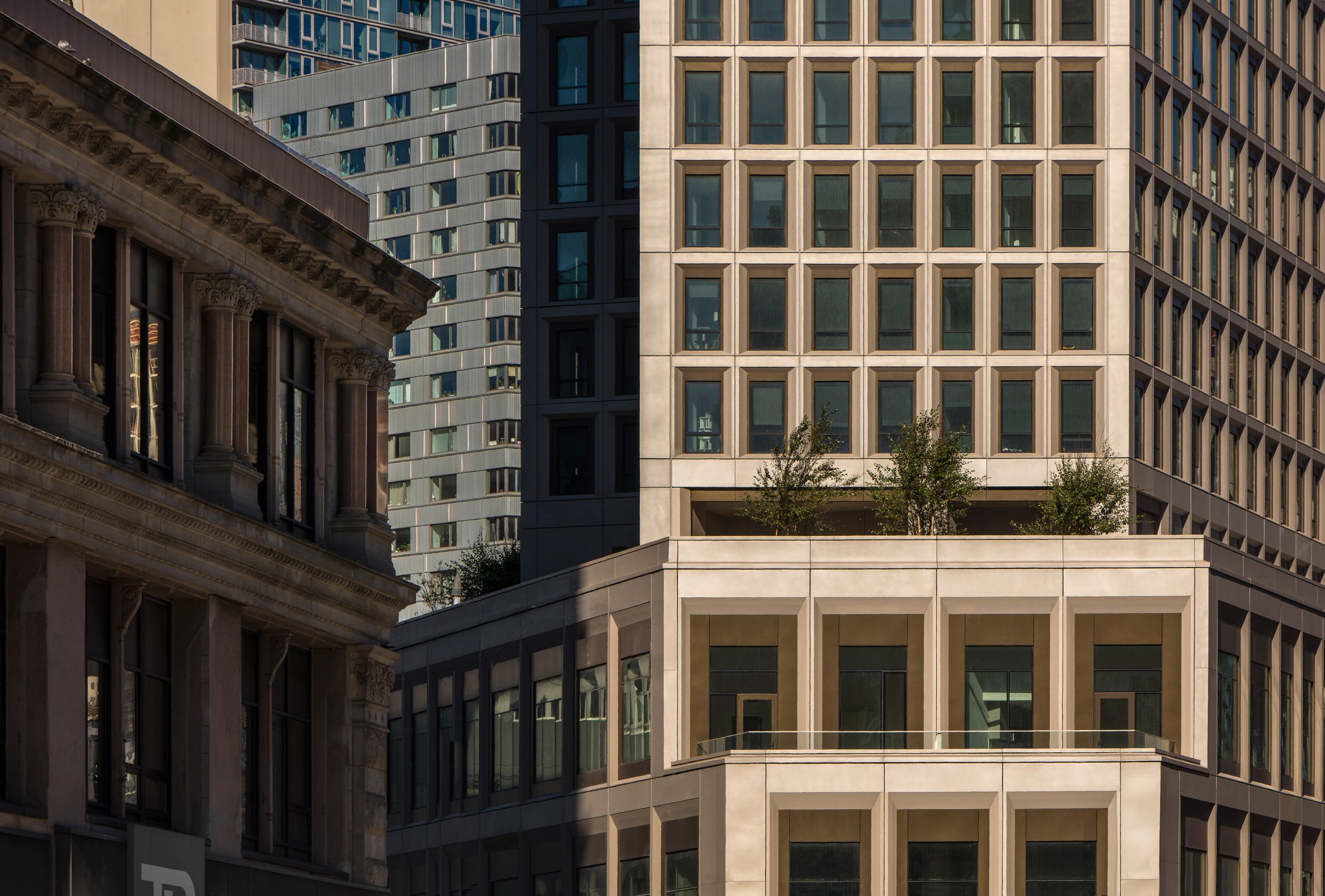 Нижні рівні перегукуються з масштабом сусідніх історичних споруд, а верхні — прямують у небо, формуючи новий силует району. Такий підхід допомагає хмарочосу органічно вписатись у щільну міську тканину, не руйнуючи її візуально.