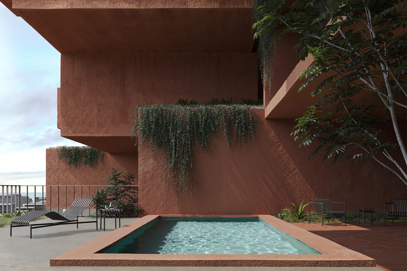 Теракотовий відтінок фасаду відсилає до глинистих ґрунтів Аттики. Це не просто декоративний прийом. Спеціальні текстуровані покриття надають поверхні тактильності та глибини, завдяки чому будівля живе в діалозі із сонячним світлом Середземномор'я. Протягом дня фасад змінюється — тіні підкреслюють рельєф, посилюючи ефект тектонічних пластів.
