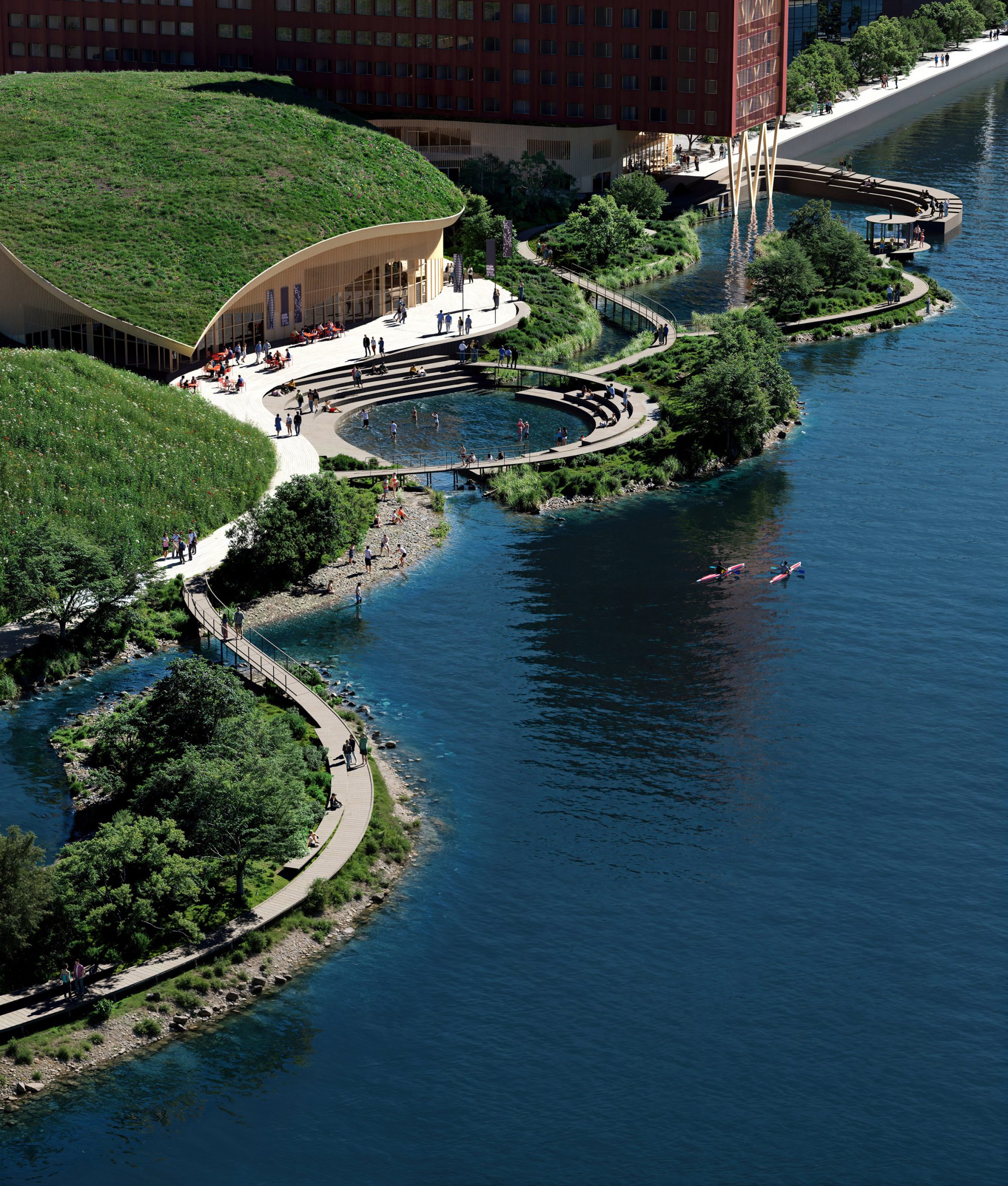 Там, де раніше проходили залізничні колії, з'явиться набережний парк та культурний центр, що об'єднує театр, конференц-зал та громадські простори. Серцем проекту стане будівля з плавною, горбкою формою, накрита арочним зеленим дахом.
