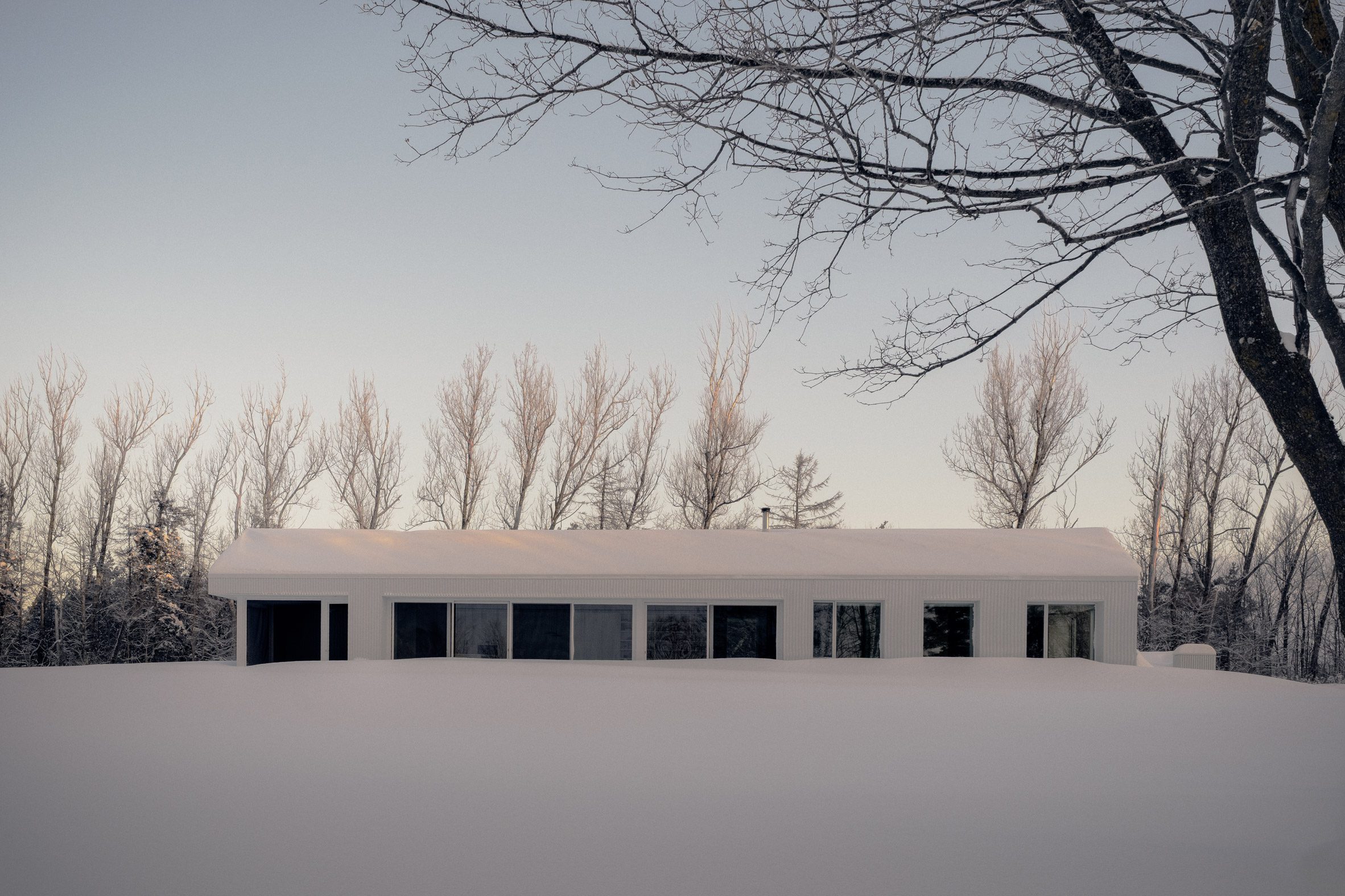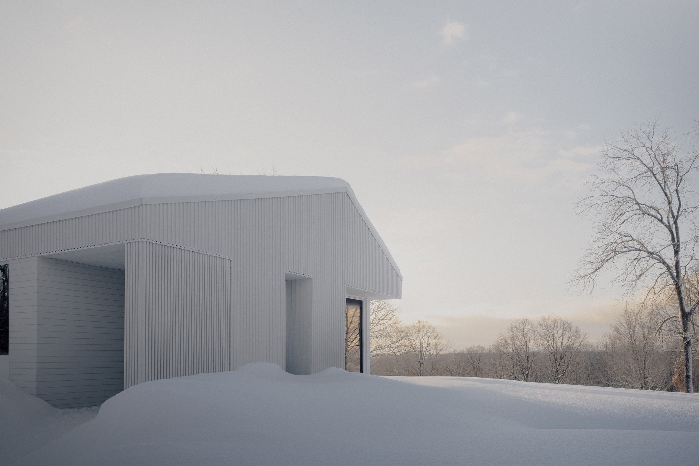 Timbertop House — це 245 квадратних метрів сучасного життя, розташовані на високій ділянці площею 200 акрів, що належить одній сім'ї вже кілька поколінь. Білий фасад будинку ніби розчиняється у зимовому пейзажі, створюючи враження, що будівля завжди була частиною цього горбистого ландшафту.