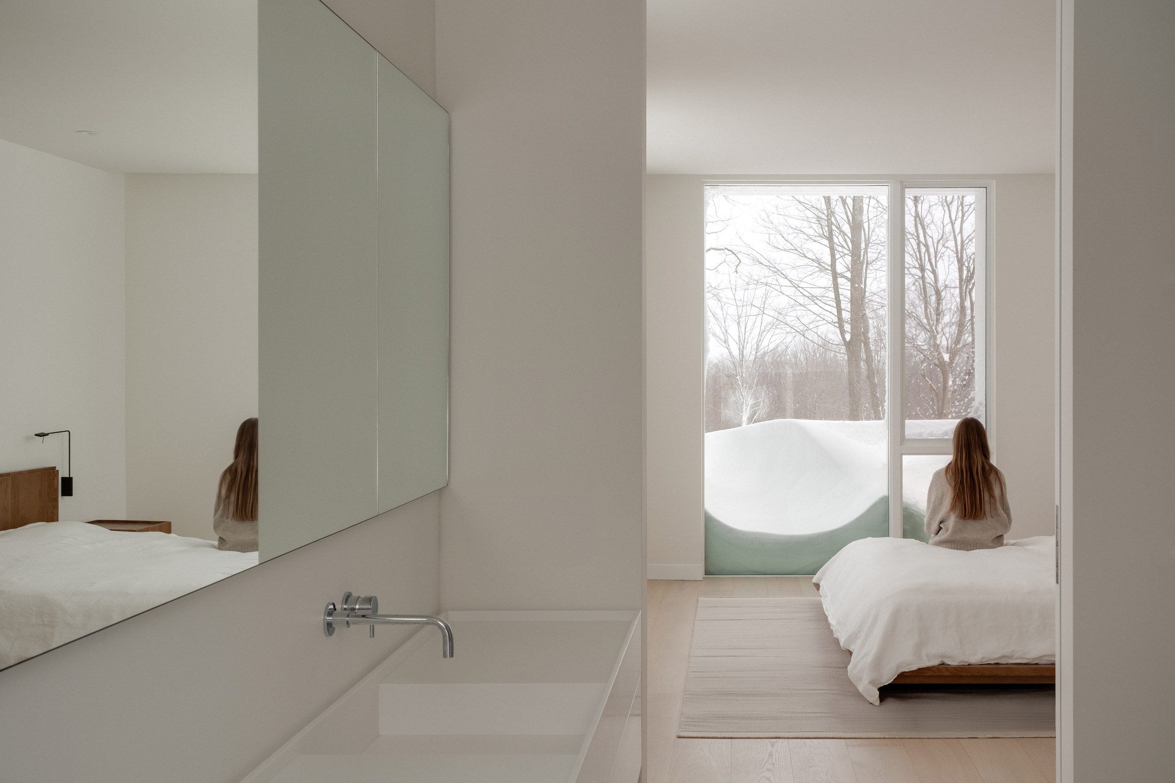 Розташування на височині дозволяє будинку стати частиною пейзажу, не порушуючи його гармонії. Кожне вікно продумане так, щоб наповнювати простір природним світлом і відкривати краєвиди на навколишній ліс та снігові поля. Цей будинок ніби запрошує природу всередину, не втрачаючи при цьому чіткої архітектурної форми.