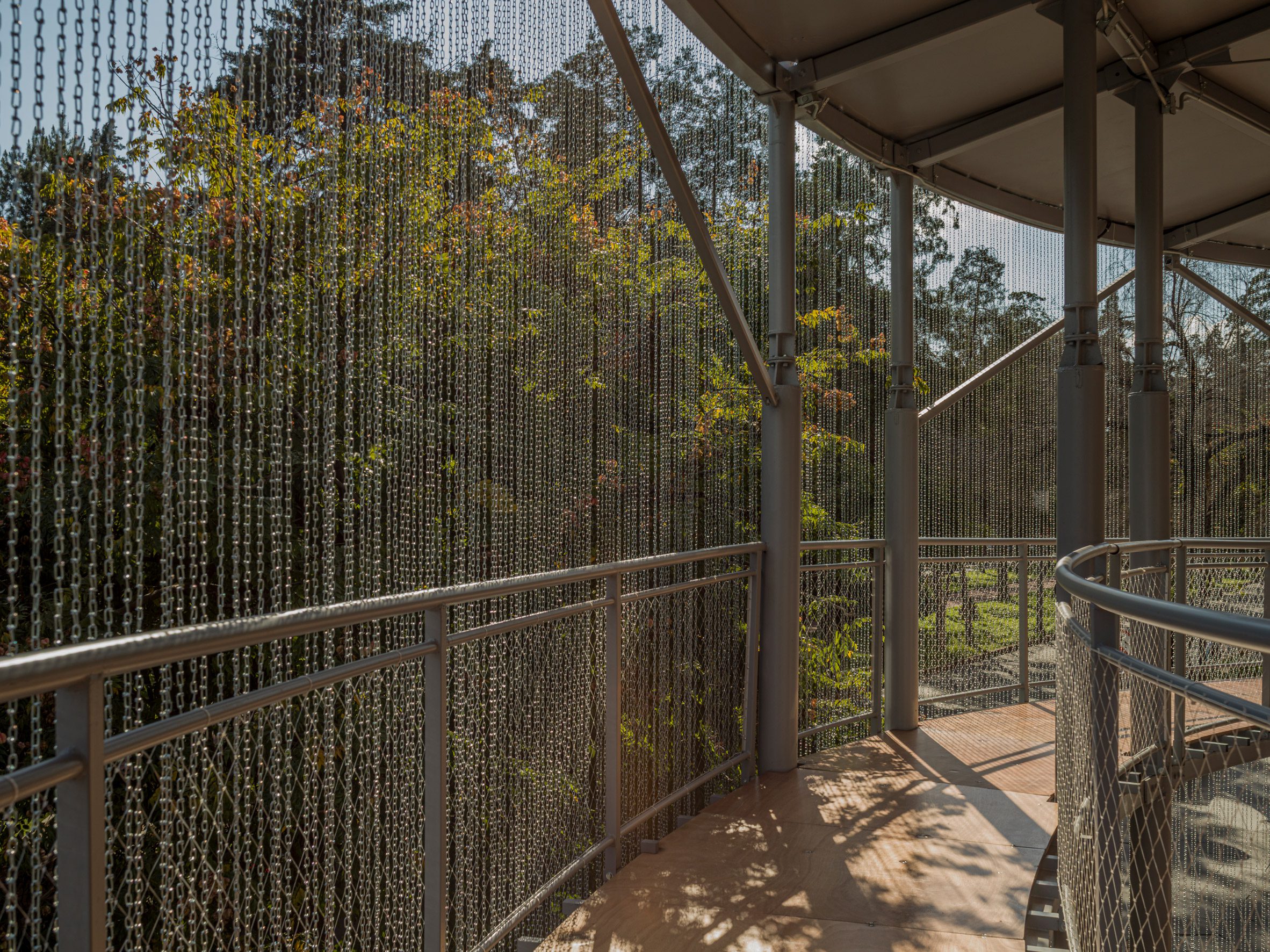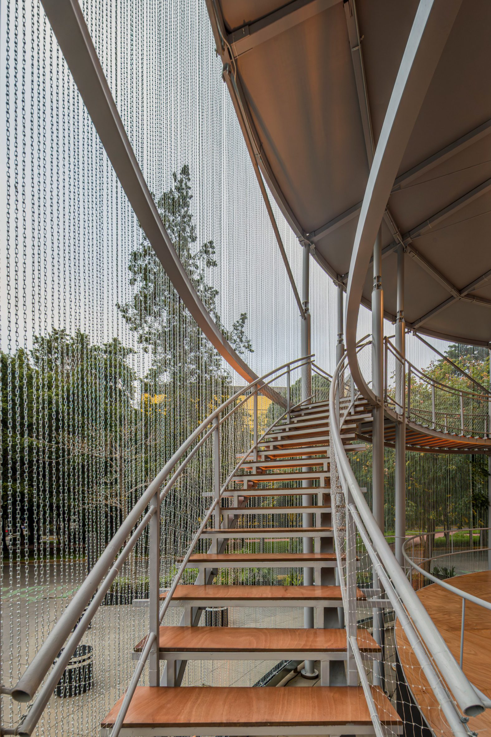 Названий A10 Pavilion, восьмиметрова конструкція побудована прямо над центральним фонтаном і оточена дерев'яною платформою, яка ніби розчиняється в просторі навколо басейну, що відбиває. Але головна магія павільйону — це його візуальна концепція: з верхньої частини конструкції звисають сотні металевих ланцюгів, якими стікає вода, створюючи враження безперервного водоспаду.